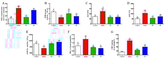 Oxidative stress is one of the factors that causes hepatic dysfunction [,]. As shown in Figure 2, an HFD significantly promoted formation of MDA, reduced activities of enzymes including SOD and GSH-Px in the liver, and increased activities of enzymes ALT and AST in the serum. Notably, both EPL and SPL treatment significantly inhibited the increase of hepatic MDA level and attenuated the depletion of the antioxidant defense system induced by an HFD in comparison with the model group, in which EPLs exhibited a better effect than SPLs. In addition, the serum CRP and TBA levels in the EP and SP group rats were significantly decreased, and the CRP values were significantly lower than that in the SP group (p < 0.05). These results indicated that PLs inhibited inflammation and limited oxidative stress caused by an HFD.