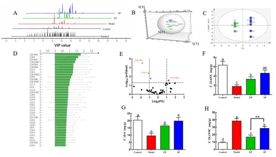 Treatment with phospholipid changes in hepatic fatty acid profiles. (A) Total ion chromatogram of liver samples and 37 fatty acid methyl esters standard, (B) PCA score 3D plot and (C) OPLS-DA score plot, (D) VIP scores of OPLS-DA, and (E) volcano plot for liver fatty acids of normal and HFD-fed rats. Potential biomarkers of fatty acid metabolism in HFD rats: (F) C22:6NS; (G) C18:0 of mouse liver; and (H) C18:1N9C of mouse liver. Peaks of the total ion chromatogram: (1) C4:0, (2) C6:0, (3) C8:0, (4) C10:0, (5) C11:0, (6) C12:0, (7) C13:0, (8) C14:0, (9) C14:1, (10) C15:0, (11) C15:1, (12) C16:0, (13) C16:1, (14) C17:0, (15) C17:1, (16) C18:0, (17) C18:1N9T, (18) C18:1N9C, (19) C19:0, (20) C18:2N6T, (21) C18:2N6C, (22) C20:0, (23) C18:3N6, (24) C20:1, (25) C21:0, (26) C20:2, (27) C22:0, (28) C20:3N6, (29) C22:1N9, (30) C20:3N3, (31) C20:4N6, (32) C23:0, (33) C22:2, (34) C24:0, (35) C20:5, (36) C24:1, (37) C22:6NS. An HFD containing 2% egg PLs (egg yolk phospholipids group, EP), and an HFD containing 2% soy PLs (soybean phospholipids group, SP). The different letters indicate significant difference at p < 0.05 determined by ANOVA (Duncan’s test). ** p < 0.01 significant EP to SP determined by Student’s t-test.