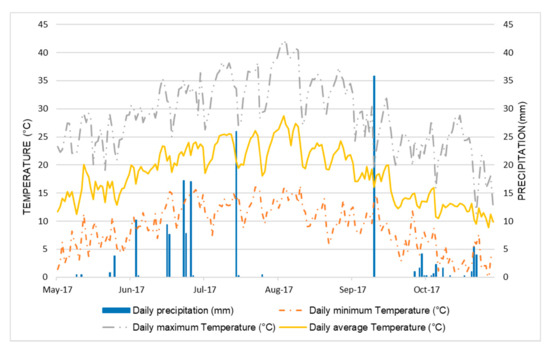 The morphology and nutritional quality traits of these 25 accessions were analyzed using seeds produced during a field experiment involving all of the 500 Pv_core1 BEAN_ADAPT lines carried out in southern Italy in 2017, at the experimental farm of the Istituto Tecnico Agrario ‘Rocco Scotellaro’ (Marsicovetere, Potenza, Italy; latitude, 40°19′56.7″ N; longitude, 15°49′28.4″ E; altitude, 592 m a.s.l.). This is an internal intensive horticultural area, characterized by a temperate Mediterranean climate with cool winters and warm dry summers. The data of maximum and minimum temperature and rainfall for the growing season (May to October) were obtained from the nearest weather station located, as shown in Figure 1. The soil at the location is a fertile coarse lime soil. The field experiment was conducted as a randomized complete block design with four replicates. Seeds were sown on 22 June 2017, in single-row plots with nine seeds per plot (1.2 m between rows; 0.2 m between plants; 0.9 m between plots). Triple superphosphate (TSP, 46% P2O5) fertilizer was applied as basal fertilization before sowing. Standard conventional agronomic management and irrigation practices were applied to the experimental fields. Plastic cover was used for weed control. Pest and disease management was done by spraying the plants with Ridomil Gold (fungicide) and Klartan 20 Ew (against aphids).