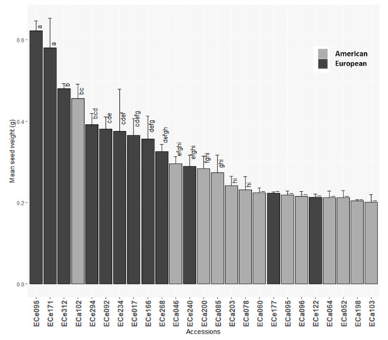 Mean seed weights for the 25 American and European accessions. Columns with different letters are significantly different (p < 0.05; Tukey test).