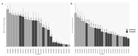Strong differences were detected for the antioxidant activities and carotenoids content. In particular, these were both higher for the American accessions (Table 4; Figure 3). The TEAC of the American and European accessions was 17.2 mmol and 10.3 mmol Trolox/kg dry seed, respectively. For YPC, 5.6 and 4.0 mg β-carotene/kg dry seed were detected for the American and European accessions (Table 4; Figure 3). The European accessions showed slightly, but significantly, higher protein content compared to the American ones (Table 4; Figure S1).