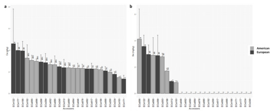 For macro-elements and micro-elements, wide ranges were observed (Table 2 and Table S2). Among the macro-elements, ANOVA F-test was significant for Na, P and Ca, however significant differences among the accessions (Tukey tests) were only seen for Na and Ca, with European accession ECe122 showing the highest content for both of these macro-elements, at 0.5 g/kg and 4.6 g/kg, respectively (Table 2; Figure 4a and Figure S1). For three accessions from America (ECa060, ECa078, ECa095), no Na was detected in the seeds (Figure S1). All of the micro-elements showed significant differences among the accessions (Table 2; Figure 4 and Figure S1). The European accession ECe122 showed the highest micro-elements content (252.8 mg/kg) (Table S2; Figure S1). Cu content ranged from 7.0 mg/kg to 16.5 mg/kg (Table 2), where European accession ECe092 showed the highest Cu content (16.5 mg/kg), with the lowest for American accession ECa046 (7.0 mg/kg) (Table S2; Figure S1). Fe content ranged from 55.4 mg/kg to 176.1 mg/kg (Table 2), with European accession ECe122 showing the highest Fe content (176.1 mg/kg) (Table S2; Figure S1). Mn ranged from 15.9 mg/kg to 34.8 mg/kg (Table 2), with the highest and lowest Mn in accessions ECa052 and ECe171, respectively (Table S2; Figure S1). The highest (77.7 mg/kg) and lowest (5.1 mg/kg) Zn contents were seen for American accession ECa046 and European accession ECe268, respectively. The highest Mo was seen for European accession ECe234 (4.3 mg/kg), and the lowest for European accession ECe095 (0.7 mg/kg) (Table S2; Figure S1). The two remaining micro-elements showed significant differences among the accessions, as Se and Ni (Table 2). Se ranged from 0.0 mg/kg to 4.1 mg/kg; interestingly for 16 of the 25 accessions (64%) no Se was detected in the seeds (Figure 4b; Table S2). Of these, eight were American (ECa046, ECa052, ECa060, ECa064, ECa078, ECa085, ECa102, ECa200) and eight were European (ECe017, ECe092, ECe095, ECe166, ECe171, ECe177, ECe234, ECe240); the ECa096 accession showed the highest Se (4.1 mg/kg) (Figure 4b; Table S2). For only one accession (ECe240) Ni was not detected, while the highest Ni was detected in ECa095 (4.9 mg/kg) (Table S2; Figure S1).
