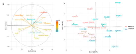 (a) Principal component analysis for the 25 American and European accessions based on morphological seed traits (seed, cotyledon, embryo, coat weights), nutritional quality traits (lipid, γ-tocopherol, δ-tocopherol, total tocopherols, YPC, protein contents; TEAC), and macro-element and micro-element contents (sums of Fe, Zn, Mn, Cu, Se, Mo, Ni contents and Na, Mg, P, K, Ca contents); (b) loading plot from the principal component analysis. Positive correlated variables point to the same side of the plot, negative to opposite sides. Color gradient (from red to blue) indicates contribution of each variable to each dimension. A, American accessions; E, European accessions.