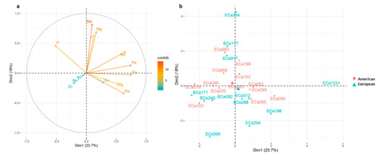 (a) Principal component analysis for the 25 American and European accessions based on macro-elements (Ca, K, Mg, Na, P) contents and micro-elements (Cu, Fe, Mn, Mo, Ni, Se, Zn) contents; (b) loading plot from the principal component analysis. Positive correlated variables point to the same side of the plot, negative to opposite sides. Color gradient (from red to blue) indicates contribution of each variable to each dimension. A, American accessions; E, European accessions.