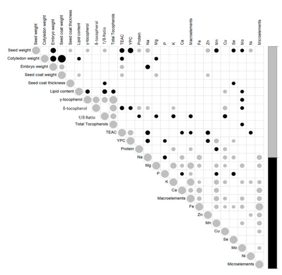 Considering seed weights and macro-elements and micro-elements, significant positive correlations were detected between seed weight and Na (r = 0.34, p < 0.001), Zn (r = 0.33, p < 0.001), and Ni (r = 0.24, p < 0.05). Seed weight was significantly negatively correlated to Mn, Se, and Mo (r = −0.30, −0.26, −0.22, respectively; p < 0.05). Significant negative correlation was seen between embryo weight and Na content (r = −0.34, p < 0.001); cotyledon weight and Mg content were negatively correlated (r = −0.22, p < 0.05), while seed coat weight was positively correlated with Mg and Zn (r = 0.23 and 0.21, respectively; p < 0.05).