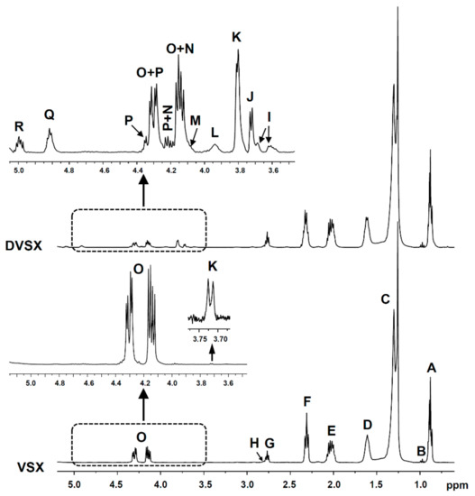 Region between 0.5 and 5.1 ppm of the 1H NMR spectra of VSX and DVSX samples, and enlargements of the region between 3.5 and 5.1 ppm, where the main proton signals of glycerides appear. The signal letters agree with those of Tables S2 and S3 of the Supplementary Materials.
