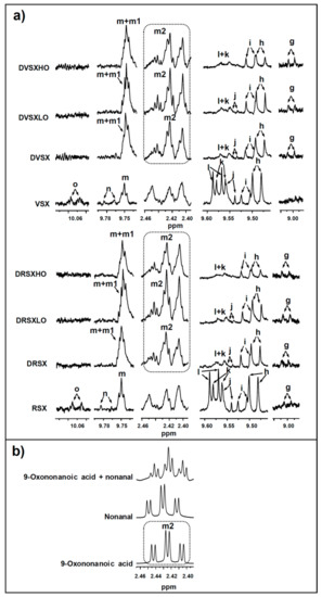 Enlargements of: (a) some regions of aldehydic signals of the 1H NMR spectra of the highly oxidized virgin and refined soybean oils (VSX and RSX), and of the lipid extracts obtained after their in vitro digestion in the absence of ovalbumin (DVSX and DRSX), as well as in the presence of a low (DVSXLO and DRSXLO) and a high proportion of ovalbumin (DVSXHO and DRSXHO); and (b) one of the 1H NMR spectral regions where typical signals of 9-oxononanoic acid and of saturated aldehydes appear, corresponding to pure 9-oxononanoic acid, to nonanal and to a mixture of both. The signal letters agree with those in Table S6. The plots corresponding to the same 1H NMR spectral region are presented at a fixed value of absolute intensity, for them to be valid for comparative purposes.