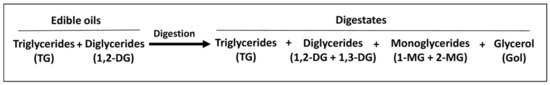 The presence of oxidation products in dietary lipids makes it an important matter for several reasons, such as those relating to the lipid digestion process, which constitutes the prelude to the effect of this kind of food components on the body. First of all, several in vitro and in vivo studies have revealed that the thermoxidation of lipids and the presence in them of triglyceride dimers and polymers negatively affects lipid digestibility by reducing their lipolysis extent and/or absorption [5,6,7]. These works, which have provided very valuable knowledge about the digestibility of thermoxidized lipids, have been conducted using thermodegraded oils coming from processes at frying temperature. However, very little is known about the digestion of lipids that have undergone oxidation at lower, moderate temperatures which, as above-mentioned, will present a different profile of oxidation products. In this regard, previous studies by our research group, carried out with slightly oxidized polyunsaturated oils, containing basically hydroperoxides (primary oxidation products), have shown that the level of lipolysis reached after submission to in vitro gastrointestinal digestion is lower than that found when digesting these same unoxidized oils [8,9,10].