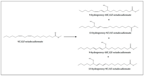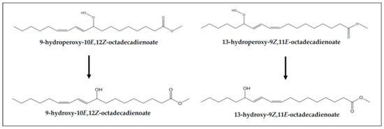 (a) Concerning monohydroperoxy-conjugated dienes. Both monohydroperoxy-(Z,E)- and -(E,E)-conjugated dienes are present in the samples before digestion and also in their digestates (see signals “a” and “b” in Figure 2, and estimated concentrations in Table 3). However, a decrease in their concentrations, especially in the case of the (E,E)-isomers, takes place during digestion, in accordance with that observed previously in slightly oxidized soybean oil samples [9]. This means that part of the monohydroperoxides present in the non-digested samples evolve during in vitro digestion to give other new compounds, and that even potential reactions with proteins or with other compounds present in the digestive juices could have taken place [67]. However, these findings do not indicate that hydroperoxide generation has not occurred during digestion, but that their rate of transformation has been higher than that of their formation. Figure 5 shows the monohydroperoxy-(Z,E)- and -(E,E)-conjugated dienes derived from 9Z,12Z-octadecadienoate groups (linoleic acyl groups) oxidation. The mechanism of formation of these compounds through free radicals is well known [68].