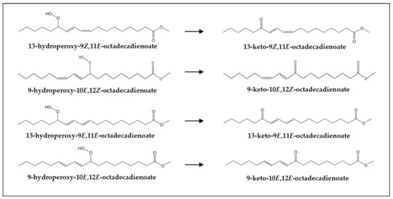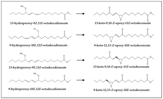 (e) Concerning keto-conjugated dienes. As commented in Section 3.1, keto-(Z,E)- and -(E,E)-conjugated dienes are present in both undigested samples (VSX and RSX) and digestates (DVSX and DRSX), their concentration being higher in the latter than in the former, probably due to their generation from the respective monohydroperoxy-(Z,E)- and -(E,E)-diene precursors (see signals “f” and “e” in Figure 2 and estimated concentrations in Table 3). Figure 7 shows the keto-(Z,E)- and -(E,E)-conjugated octadecadienoates derived from their corresponding precursors monohydroperoxy-(Z,E)- and -(E,E)-conjugated dienes. For the formation mechanism see reference [73].
