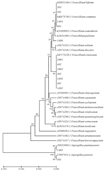 Seven isolates were identified as P. crustosum (Table 1), which is a mold that can cause spoilage in several foods such as cheese, meat and refrigerated foods [54] and has been commonly isolated and identified in cheeses by other authors [28,43,45,46,47,51,55].