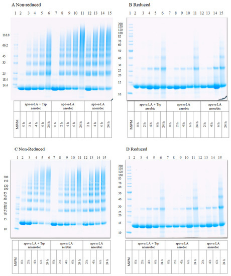 SDS-PAGE was used to visualize apo-α-LA aggregates formed by UV-B light exposure (Figure 1). Increased intensities of bands with oligomers (18–66 kDa) or aggregates (>66 kDa) and a simultaneous decrease in the intensity of monomeric bands (14.1 kDa) was observed with increasing time of UV treatment under both aerobic and anaerobic conditions and in the presence and absence of Trp (Figure 1A,C). Increased levels of oligomers and aggregates of apo-α-LA were obtained after UV treatment from 2 to 24 h in the absence of Trp (lanes 8–11) than in the presence of Trp (lanes 3–6) under aerobic conditions (Figure 1A).