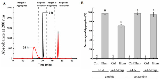 (A) Chromatogram of apo-α-LA in the presence of 2.8 mM Trp under anaerobic conditions after 0 h (black) and 24 h illumination (red). (B) Yield of total aggregates formed in illuminated apo-α-LA in the absence or presence of 2.8 mM Trp under aerobic and anaerobic conditions. Results are presented as mean values obtained from three independent experiments with standard deviations shown by error bars. Means with different letters are significantly different.