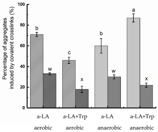 Covalent cross-links formed in apo-α-LA in the absence or presence of 2.8 mM Trp under aerobic and anaerobic conditions obtained after the addition of 5% SDS to disrupt non-covalent interactions. Non-reduced samples are shown in light grey bars, while samples reduced by DTT are shown in dark grey bars. Results are presented as mean values obtained from three independent experiments with standard deviations shown by error bars. Bars with different letters are significantly different.