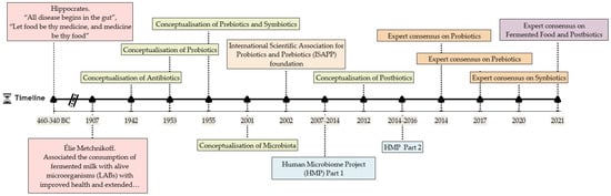 In addition to the unquestionable beneficial effects of probiotics and prebiotics, emerging concepts are opening the door to new microbiome-based approaches. Figure 1 highlights the major historical milestones in microbiology, the biotics family, and health, along with other significant landmarks. Thanks to technological process in the last decades, tremendous advancements have taken place regarding the study, classification, and characterisation of the different probiotic-related concepts. Additionally, relevant is the foundation of The International Scientific Association for Probiotics and Prebiotics (ISAPP), which helps in the definition of the emerging concepts by providing expert consensus, among other activities. In addition to the new biotics terms, the notion of postbiotics has to be emphasised, which is a term first coined in 2012 by Tsilingiri and colleges [19] and recently updated in the ISAPP expert consensus document [20]. Experimental studies have indicated that microbial components can exhibit different bioactivities than their viable counterparts (probiotic) [21], which is why they present an attractive area for research. The category of postbiotics has gained significant interest; in fact, more than 87% of total scientific publications on this topic have been carried out in the past three years (according to Pubmed.gov, cosulted in June 2021).