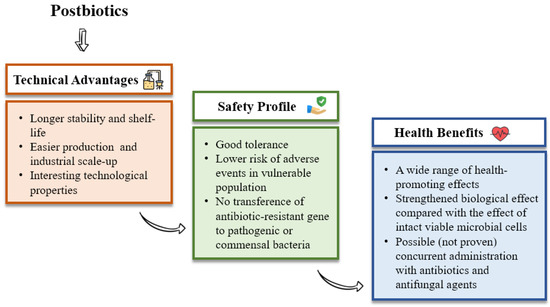 The growing interest regarding postbiotics is partially explained by the advantages they provide, which are summarised in Figure 2. Briefly, (i) they are quite safe; (ii) they are well-tolerated and associated with reduced risk for adverse effects in vulnerable individuals (pregnant women, premature children, old adults, subjects immunocompromised or presenting an impaired immune function or intestinal barrier) [27,28,29,30]; (iii) they have no risk for transferring antibiotic-resistant genes to pathogenic or commensal bacteria [31]; (iv) their effectivity is independent of the cell viability, which ensures longer stability and improved shelf-life [20]; (v) they present an easy industrial (large-scale) production [32]; (vi) they show interesting technological properties (i.e., rheological properties of exopolysaccharides (EPS) in the food industry as a stabiliser [32,33] or bio-preservative effects of LAB bacteriocins [34]). Other properties include (vii) the wide range of health-promoting effects they provide (See Figure 3), some of which can be reinforced in comparison with the effect of intact viable microbial cells [35]. Another very interesting feature of postbiotics is that, due to their nature, (viii) it appears feasible that they could be used with concurrent administration with antibiotic and antifungal agents.