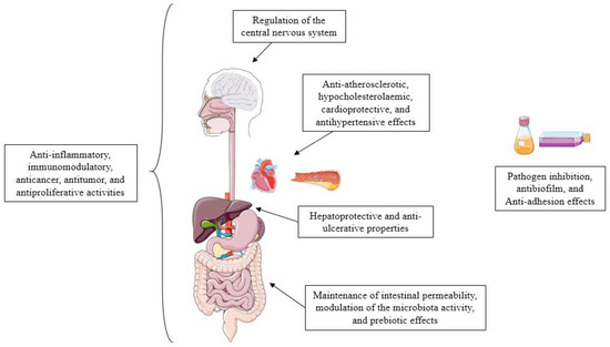 Since the concept of postbiotic involves a broad range of compounds and substances diverse in nature and content (mentioned above), very different biological effects have been described (Figure 3). Some of these effects are restricted to the intestinal tract, for example, establishing a healthier GM [21,23], exerting prebiotics effect [36], or controlling the gut permeability [39,40]. Despite this, other effects not only affect the epithelial barrier but also cause systemic effects [24]. Collectively, the current evidence indicates that postbiotics can exert anti-inflammatory, antioxidant, immunomodulatory, pathogen inhibitory, anti-obesogenic, anticancer, antitumor, antiproliferative, antibiofilm, anti-adhesion, antihypertensive, hypocholesterolaemic, hepatoprotective, cardioprotective, anti-atherosclerotic, and anti-ulcerative effects (previously reviewed in [23,24,31,32]).