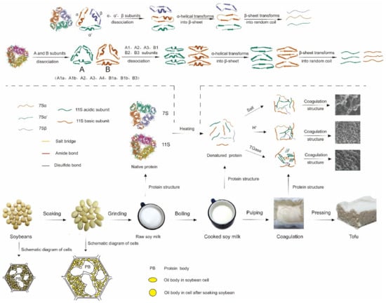 To obtain raw soy milk for tofu production, soybeans are soaked, pulped, and filtered. For tofu production using the raw soy milk, the milk is first heated and then a coagulant is added to form tofu curd. The curd is then pressed to obtain a tofu product. As shown in Figure 2, the structure and content of soy protein undergo numerous changes throughout the tofu production process. The quality of the final tofu product is affected by soybean varieties, storage conditions, soaking, grinding, soymilk pretreatment, types of coagulants, operating conditions, pressing, and packaging.