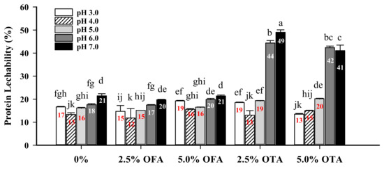 | 4% Pancreatin (4 h, 37 °C, pH 7.5) | 2.5% OTA | (27.6 b) | 49.3 ± 1.4 a,b | 42.4 ± 0.4 b | 54.7 ± 1.9 a | 77.2 ± 2.2 a | 89.0 ± 2.2 a | 89.1 ± 0.4 a |