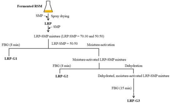 Experimental scheme. RSM, reconstituted skim milk; SMP, skim milk powder; FBG, fluidized bed granulation; LRP, LGG-fermented RSM powder; LRP-G1, granules obtained by FBG of LRP-SMP mixture (50:50); LRP-G2, granules obtained by FBG of moisture-activated LRP-SMP mixture (50:50); LRP-G3, granules obtained by FBG of moisture-activated, dehydrated LRP-SMP mixture (50:50).