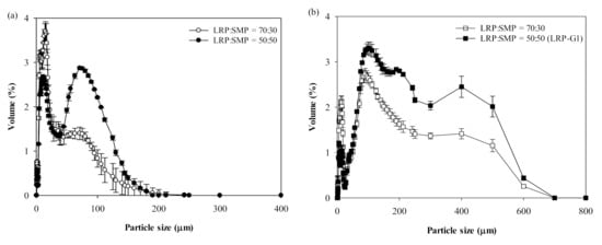 Figure 2a shows the particle size distribution obtained after the addition of SMP to LRP at different ratios (30% or 50% SMP). Three major peaks were observed for both LRP-SMP mixtures: Peak 1 (d4,3 ≈ 2–7 µm), Peak 2 (d4,3 ≈ 27 µm), and Peak 3 (d4,3 ≈ 80–112 µm) (Figure 2a; Table S3). The mixture of 30% SMP showed peak volume fractions of about 25%, 60%, and 5% for Peaks 1–3, respectively; however, the volume fraction of Peak 1 decreased to about 7%, and that of Peak 3 increased to about 41%, when the fraction of SMP in the mixture increased to 50% (Table S3).