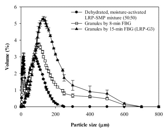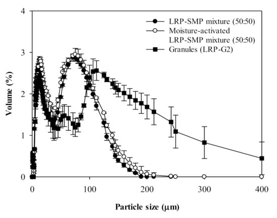 Figure 3 shows the particle size distribution of LRP-SMP mixture (50:50) before and after moisture-activation by water-spraying (2.5%, w/w), and the granules (LRP-G2) obtained by FBG of the moisture-activated LRP-SMP mixture. Moisture-activation is the process of activating particle agglomeration by facilitating the formation of either water-bridges or sinter-necks between particles using a small amount of water [14,15,16,29]. The small fraction of the finest particles in the LRP-SMP mixture (Peak 1) disappeared after moisture-activation, indicating consolidation of the finest particles into larger agglomerates due to the formation of either water-bridges or sinter-necks. However, the other two peaks remained almost unchanged in size and volume fraction (Table S4). The smaller particles tended to form water-bridged or sinter-necked agglomerates more easily than the larger particles, due to their higher affinity to water resulting from a higher surface area-to-volume ratio [30].
