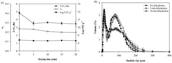 (a) Changes in the viable cells, moisture content (X), and water activity (aw) of moisture-activated LRP-SMP mixture (50:50) during 20-min dehydration at 50 °C, and (b) the particle size distribution of the mixture treated with 5- or 10-min dehydration or without dehydration.