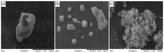 The granules (LRP-G2) showed three major peaks in their size distribution; Peak 1 (d4,3 ≈ 33 µm), Peak 2 (d4,3 ≈ 65 µm), and Peak 3 (d4,3 ≈ 290 µm) (Figure 3; Table S4). The particles of Peaks 1 and 3 accounted for most of the particle volume (51 and 41% volume fractions, respectively; Table S4). Compared to LRP-G1, LRP-G2 had a larger fraction of small particles and did not have big (about 500 µm) particles. This is probably because the moisture-activation created more regions of excess moisture, and the particles in this region were partially dissolved and dried without proper formation of water-bridges or sinter-necks between particles during the FBG. Consequently, the overall d4,3 of LRP-G2 (about 75 µm) was 2.2-fold smaller than that of LRP-G1 (141 µm; Table S3). The span of LRP-G2 (6.57) was also larger than that of LRP-G1 (3.49; Table S3). The results indicate that the moisture-activation may not be effective for improving the FBG performance of the LRP-SMP mixture. As in the general MADG process, the dehydration step may be required after moisture-activation to enhance the efficiency of FBG by removing excess water from the particles [31].
