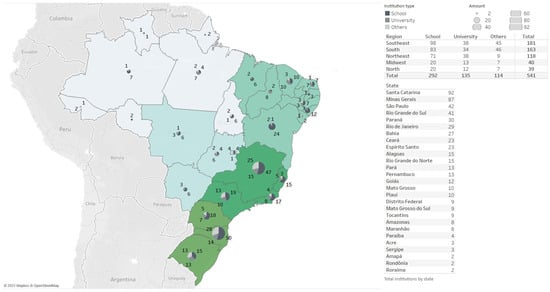 Most participants were nutritionists (74%), and 26% were categorized as other professionals (technicians, administrative staff, and social workers). Most of them claimed to carry out management activities (81.7% planning menus, 78.2% preparing shopping lists, and 68% buying food). Figure 1 shows the distribution of participants by country region, state, and institution type in which they worked. The region with the largest number of participants was the Southeast (n = 181), followed by the South (n = 163) and Northeast (n = 118). The ones with the lowest number were the Midwest and the North, with 49 and 39 participants. The states with the largest number of participants were Santa Catarina (n = 92), Minas Gerais (n = 87), São Paulo (n = 42), and Rio Grande do Sul (n = 41). Regarding the type of institution, most participants reported working for school food MUs (n = 292), followed by MUs of university restaurants (n = 135).