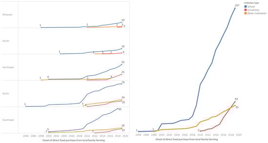According to our study, the MUs of the school food program implemented the government purchasing policy more than other institutions. Moreover, purchases from family farming increased from 2010 on. These results may be related to the longer time elapsed since the mandatory food purchase from local family farms for schools. The purchase became mandatory for public schools in the country as of 2010 [19,31], while other public institutional food services were mandated only in 2016 [24]. This outcome is similar to that of a previous study that suggests the importance of regulatory frameworks to drive the implementation of food purchase policies from local producers [39].