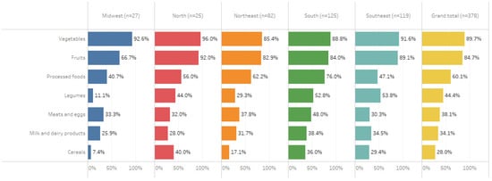 Figure 3 shows the food groups purchased from family farming by the MUs that implement the government’s food procurement policy, stratified by region of the country. In all regions, the typical food group purchased was vegetables, followed by fruits and processed foods. The South had the highest percentage of institutions that bought food processed by family agribusiness (76%), followed by the Northeast (62%). Restaurants in the Midwest bought legumes (11%) and cereals (7%) the least, a value well below the national average (44% and 28%, respectively).