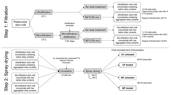 In this study, four cold-renneted skim milk powders varying in casein/whey protein ratio and whey protein denaturation were produced. Figure 1 shows the related process scheme.