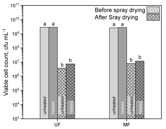 Viable cell count before and after spray drying of UF and MF. The standard deviations of all samples before spray drying were ±5 × 104 cfu mL−1 and after spray drying 2 × 103 cfu mL−1 (presented, but not visible due to scale). Letters indicate the statistical significance at p ≤ 0.05.