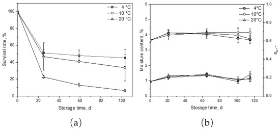 Survival rate of Lactobacillus paracasei ssp. paracasei F19 (a) and moisture content and aw (b) as a function of storage time.