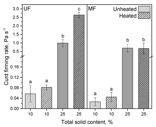 Curd firming rate of unheated and heated reconstituted UF and MF rennet gels with 10 and 25% total solid content. Letters indicate the statistical significance at p ≤ 0.05.