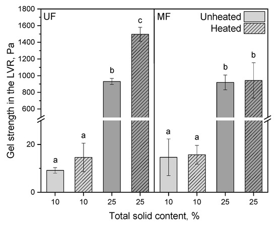 Gel strength in the linear viscoelastic region (LVR) of unheated and heated reconstituted UF and MF rennet gels with 10 and 25% total solid content. Letters indicate the statistical significance at p ≤ 0.05.