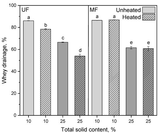 Whey drainage after incubation (t = 1 h, ϑ = 40 °C) and centrifugation at 4000× g (t = 45 min, ϑ = 20 °C) of unheated and heated reconstituted UF and MF rennet gels with 10 and 25% total solid content. Letters indicate the statistical significance at p ≤ 0.05.