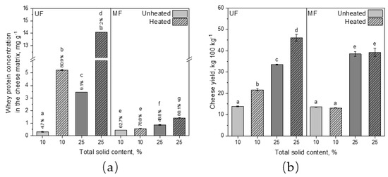 Whey protein concentration in the cheese matrix (a) and cheese yield (b) after incubation (t = 1 h, ϑ = 40 °C) and centrifugation at 4000× g (t = 45 min, ϑ = 20 °C) of unheated and heated reconstituted UF and MF rennet gels with 10 and 25% total solid content. Letters indicate the statistical significance at p ≤ 0.05.