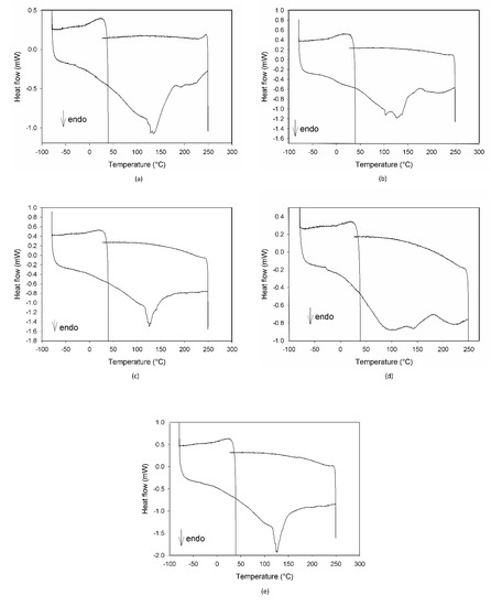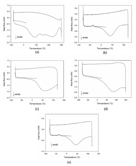 Differential scanning calorimetry (DSC) analyses were performed by heating the samples (about 5 mg) from −80 °C to 300 °C at 5 °C/min under N2 atmosphere in open Al crucibles in a Q2000 instrument interfaced with a TA 5000 data station (TA Instruments, USA) and subsequently cooling them back to room temperature.