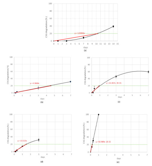 As mentioned above, during stress testing it is recommended to select the specification limit of degradation within the range of 5–20% degradation of the monitored marker [14,29], as it would lie in the first degradation stage which typically follows a linear behavior [30].