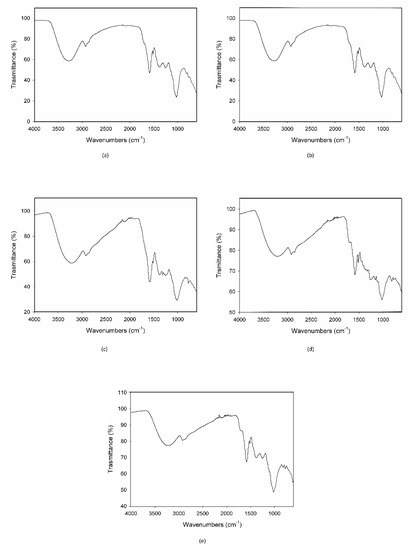 When MCE was exposed to the strongest condition, (70 °C-75% RH), C3G totally degraded during the first 24 h, following zero-order kinetics, and therefore its degradation was not dependent on its initial concentration (Figure 3e). This is demonstrated also by the IR spectroscopy; the acquired spectrum for this sample was totally different from those before treatment (Figure 2b and Figure 4a). On the other hand, when samples were submitted to mild conditions (45 °C-75% RH and 70 °C-30% RH), two different steps were identified: in the first part of the reaction the degradation rate was faster, while it decreased step by step in the last phase (Figure 3c,d), following the classical degradation kinetic already stated by Waterman [22]. This behavior could be due to an initial faster degradation of free C3G which was highly exposed to oxygen action, followed by a slower degradation of bounded anthocyanin fraction, in accordance with the results reported by Tonon for açai juice [13]. The IR spectra for the samples treated for 4 h and 3 d at 70 °C-30% RH are reported in Figure 4b,c; after only 4 h of treatment the characteristic features of the functional groups of C3G were almost totally lost and after 3 days the spectrum was almost superimposable to the spectrum of a totally degraded sample (Figure 4a). This trend was not observed at 45 °C-30% RH (Figure 3b), but a longer monitoring period is likely required and more time points should be evaluated to better investigate degradation kinetics under this condition. When the degradation rate was monitored in the presence of high humidity at room temperature (25 °C and 75% RH), the reaction had an opposite trend (Figure 3a). In fact, anthocyanins are known to be extremely sensitive to high temperatures, but high humidity levels could also contribute to increases in their instability by accelerating chemical and physical degradations [9,13]. Thus, at room temperature and high humidity values, C3G degradation is only delayed and gets faster after three days of exposure to such conditions (see IR spectra in Figure 4b,e for 3 days and 7 days aging).