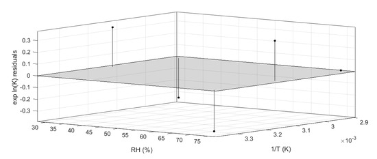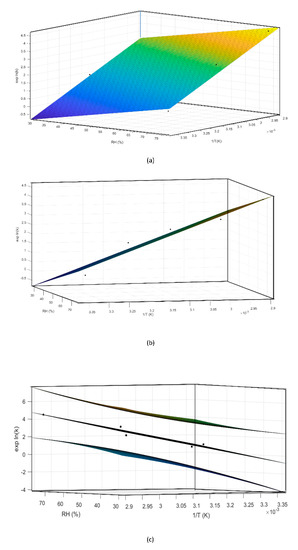 However, the effect of T and RH could be modeled on lnK following different approaches in order to find the best fit with experimental data (e.g., adopting other degradation shape parameters, or introducing new interaction terms to Equation (1), especially when no linear relation between the observed degradation rate and time is present.) Thus, in order to investigate the possibility of further improvement of the fit, the effects of the two predictors, 1/T and RH%, on lnK values and their interactions were also graphically estimated using the interaction plot analysis (Figure 8). Temperature had a positive effect on lnK values, which increased with lower 1/T values, as shown in Figure 8. Moreover, humidity exerted an additive effect on temperature, as evident from a positive slope of the three curves. However, the interactions between these two predictors were not meaningful, confirming the proper use of the original moisture-corrected Arrhenius equation.