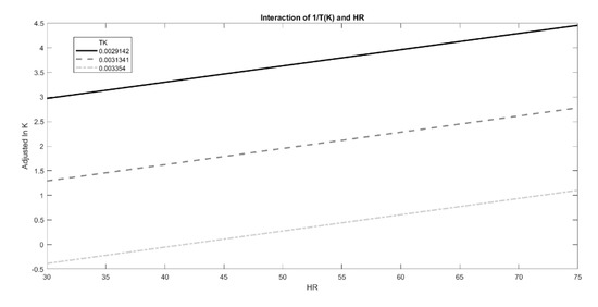 Interaction plot of the effect exerted by growing RH % on lnK at fixed T values (1/T (K)), represented by the different lines.
