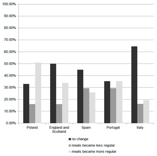 It was observed that there was a statistically significant dependence (p = 0.0045) between meal consumption regularity during the pandemic and the country of residence (Figure 1).