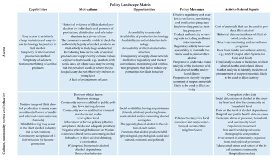 There is a strong economic driver for individuals and organizations to engage in illicit practices [16]. Factors that frame and incentivize this activity include weak public and private institutions, corruption, low Gross Domestic Product (GDP), low tax morale, high taxes or complex tax systems [66,67] and the price differential between illegal and legal alternatives [67]. The classic “fraud diamond” model proposes that four factors influence the potential for illicit behavior: motivation, capability, opportunity and pressure [68]. The main motivation for illicit behavior may be the economic gain derived, to circumvent cultural or religious restrictions on access to alcohol and/or to support an individual’s own alcohol dependence. Capability, i.e., the ability of an individual or organization to undertake deceptive activities requires both the knowledge and equipment to produce alcohol for home use, evading the associated taxes and excise duty or otherwise to distribute and sell illicit alcohol. The opportunity to supply illicit alcohol, either to themselves or others, is also a factor of influence and such opportunity is mediated by the level of regulatory governance in particular countries. Thus, there are both economic and social drivers of illicit alcohol production, distribution and sale, and these form pressure that leads to the development of socioeconomic networks with inter-related strategies, activities and dynamic components that drive illicit alcohol consumption or other forms of alcohol-based product abuse [69]. In order to understand these drivers and their interrelationship in more depth, a conceptual policy landscape matrix has been postulated (Figure 1) that illustrates the interaction between capabilities, motivations and opportunities and factors such as access, culture, community norms and behavior, economic drivers and knowledge and information. Pressure was not taken into consideration as a single issue here, but seen to be embedded implicitly in all aspects of the policy landscape matrix. The matrix provides an opportunity to consider policy implications for reducing illicit alcohol production, distribution, sale and consumption, policy measures that could be employed at the state (public) and the market (private) level and the potential data sources (signals) that can arise.