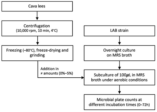 Overall experimental procedure for the in vitro assessment of the effect of cava lees on the growth of different LAB strains.
