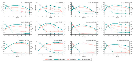 The effect, in terms of growth, of adding 5% (w/v) of cava lees to the 21 tested LAB strains is shown in Table 1. A statistically significantly higher microbial count due to the presence of cava lees was observed at some time point in 12 strains; their growth kinetics and the pH decrease are depicted in Figure 3. The only species that did not show this effect were L. gasseri and P. pentosaceus.