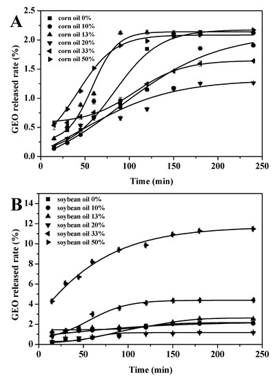 The release properties of the GEO and GEO-VO microcapsules were determined as a function of time (Figure 3). The stability of the emulsion and droplet size have important effects on the sustained release and shelf life of the volatile compounds in the microencapsulated oils [47], and the encapsulation affects positively the stability of bioactive molecules [48]. Consistent with the results of the size distribution and the physical stability, the GEO-CO microcapsules with CO concentrations of 10%, 13% and especially for 20% showed a slower GEO release than those pure GEO microcapsules (Figure 3A). The GEO was released faster in the first hour of incubation and then was gradually decreased. Microencapsulation has important effects on the release properties of the enclosed contents. Zhang et al. [49] prepared fragrance microcapsules encapsulated by maltodextrin and resistant starch as wall materials and found its release rate was mild and gentle. Ozdemir et al. [50] used gum Arabic, maltodextrin and whey protein isolate as the wall materials to gain basil essential oil microcapsules, with a release rate of 58.97%. The rapid release of GEO in the initial stage might be due to the swollen hydrated wall materials leading to an increase in the permeability of the wall to the solvent and to a certain extent the release of the adsorbed GEO at microcapsules surface into the media [51,52]. A similar trend was observed in the release behavior of GEO-SO microcapsules, and the release rate of the encapsulated GEO with the addition of 20% SO was well-controlled. Nevertheless, the excess addition of 33–50% CO or SO could reduce the encapsulation efficiency, thus increasing the amounts of GEO at the surface and thereby raising the released rate of the GEO. Unfortunately, the release rate of GEO-OO microcapsules was higher than that of pure GEO microcapsules, which probably was due to the unstable nature of olive oil itself and the incompatibility of GEO and olive oil, which was not conducive to the formation of polymer networks controlling the GEO release. In addition, the release rate curve of each GEO microcapsule gradually flattened with time, indicating that the GEO was successfully embedded and slowly released.