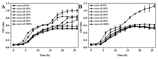 Growth curves of Gram-negative bacteria E. coli and Gram-positive bacteria S. aureus treated by GEO-VO microcapsules with different concentrations of VOs were shown in Figure 4. For the control group of pure VO-containing microcapsules without GEO addition, the growth curves of both E. coli and S. aureus reached a stable growth stage in 20 h, and the absorbance value was approximately at 1.0. A reduction of both E. coli and S. aureus growth was observed for all GEO-VO microcapsules, with the 20% CO-containing GEO microcapsules demonstrating the highest inhibition effectiveness. The stable growth stages for both E. coli and S. aureus were reached in 16, 17 and 17 h with the minimum absorbance value in the range of 0.5–0.6 when treated with 20% CO, SO and OO, respectively, indicating that GEO-VOs exhibited good inhibition effectiveness in the growth of both E. coli and S. aureus in an encapsulation efficiency-dependent behavior, which was associated with the physical stability of the GEO emulsion and the volatile compounds of GEO. Other researchers also found that the garlic essential oil was particularly efficient and showed activity on a large panel of pathogens [53]. As reported by Casella et al. [54], the main antibacterial constituents in GEO were allyl-group-containing compounds, including Diallyl sulfide, Diallyl disulfide, Diallyl trisulfide, and Diallyl tetrasulfide. After GEO was mixed with different VOs, the compatibility in the chemical composition of GEO and VOs should also be considered except for the influencing factors for GEO emulsions and microcapsules themselves.