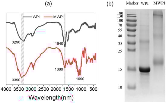 FTIR spectra (a) and SDS-PAGE (b) of WPI and MWPI.
